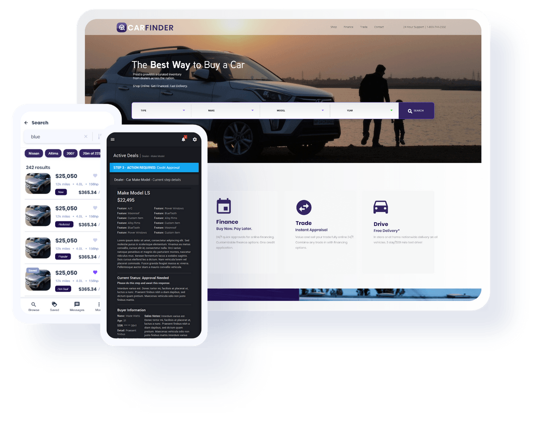 In this example, we designed and built a mobile app and two web clients and a system for online vehicle sales. This included transacting and financing vehicles. Additionally, an AI/ML concept for motivating and tailoring the buying experience was created.